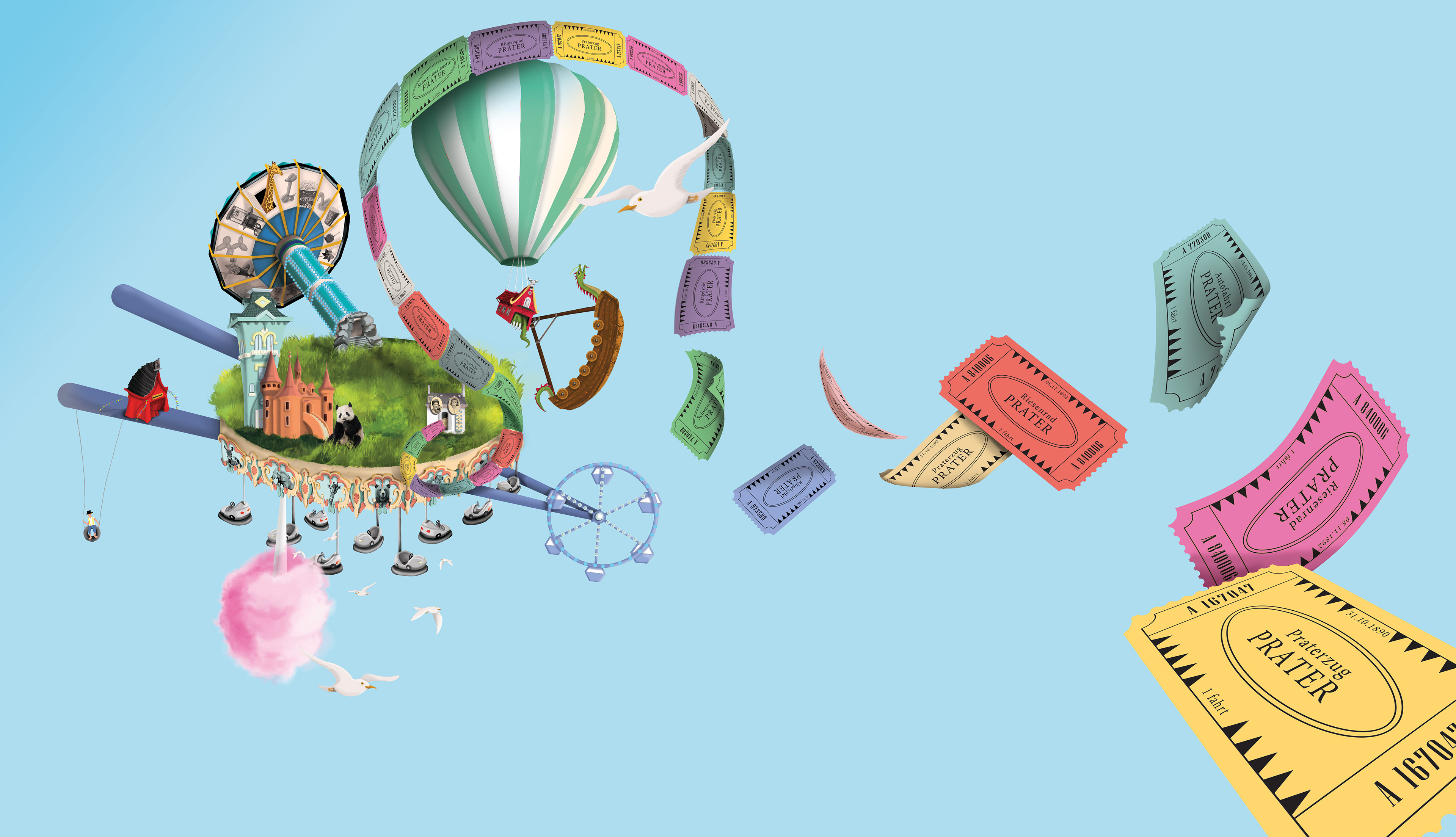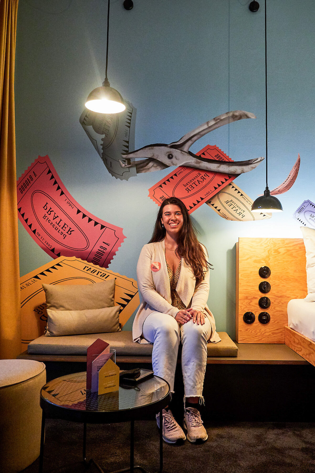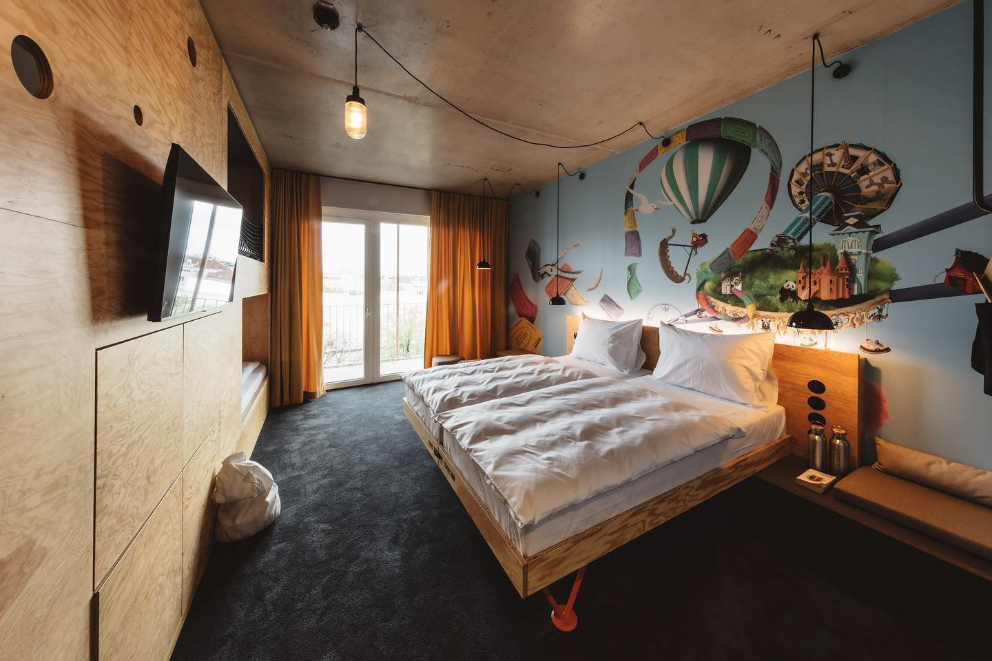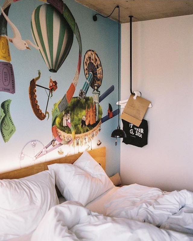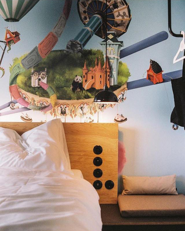 With the theme of flying as the only specification, the 4 m long wallpaper illustration "Luna Park" was designed. It can be seen in the hotel rooms of